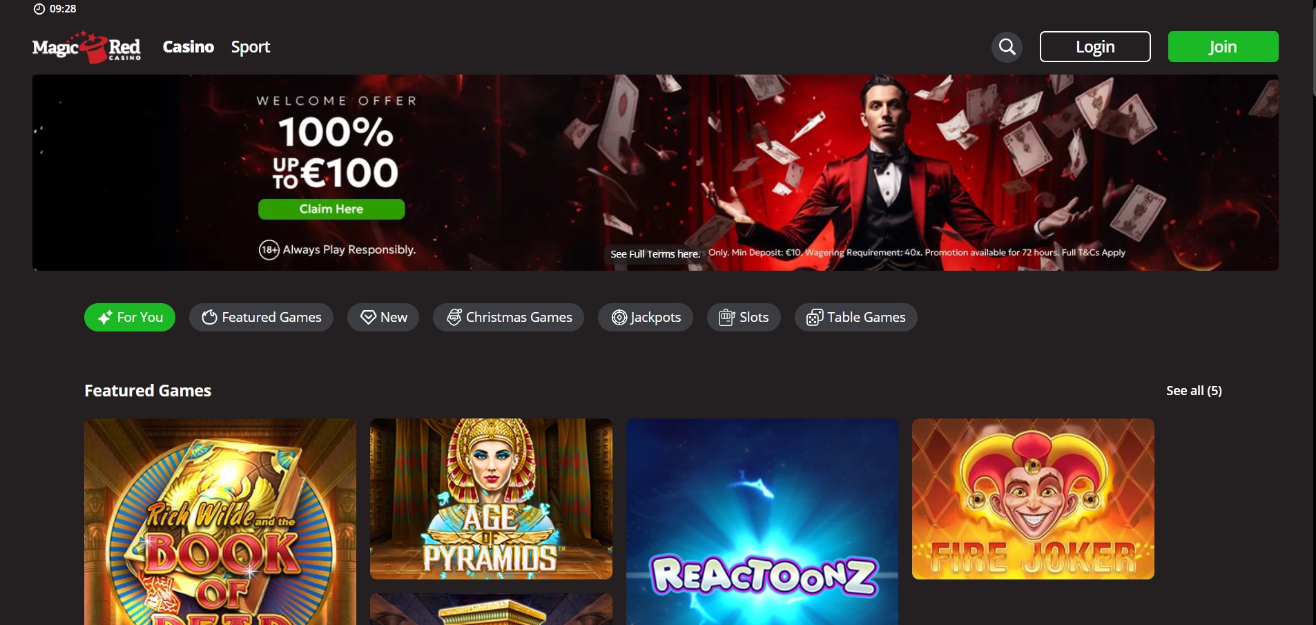 | MagicRed Casino | ✅ Available | ✅ Yes | ✅ Multiple Variants | ✅ Yes | ✅ Includes Gameshows | 100% up to £100 + 100 Free Spins |